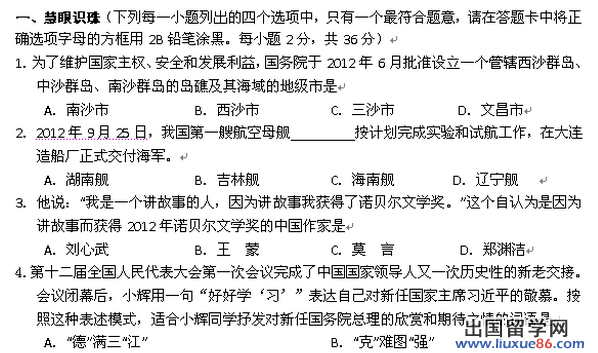 2013年中考已經(jīng)結(jié)束,學(xué)子們一定十分關(guān)注成績(jī)線的指標(biāo),小編也是和大家一樣。為了能給大家在2014年中考考試考出好成績(jī),小編已在出國(guó)留學(xué)網(wǎng)分享2013年湘潭中考政治試題及答案。(CTRL+D即可收藏)