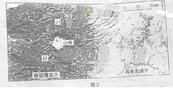 圖2為45ºN附近某區(qū)域的遙感影像,共中深色部分為植被覆蓋區(qū),淺色部分為高原荒澳區(qū);終年冰雪覆蓋的山峰海拔3424米,距海約180千米.讀圖2.完成4~6題。