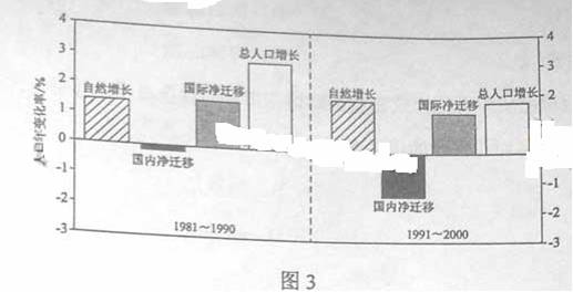 6.圖3示意某城市20世紀(jì)80年代和90年代平均人口年變化率,當(dāng)前該城市中人口約1300萬(wàn)。據(jù)此完成7~8題。