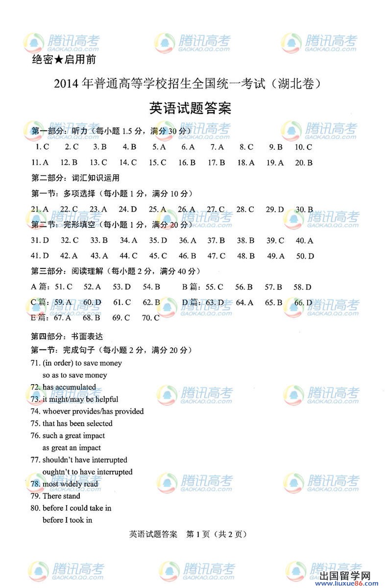 一年一度的高考又到來,小編首先祝各位考生們在這次2014高考中發(fā)揮出自己的最大實力!沉著冷靜,仔細認真!2014年湖北高考真題會在考后發(fā)布,出國留學網(wǎng)高考頻道小編緊密關(guān)注2014年湖北高考英語真題及答案,答案一旦公布,我們將會在此頁面及時更新顯示,請廣大考生及家長注意本頁面更新,如果您需要查找的真題及答案沒有顯示,請按ctrl+F5進行刷新。