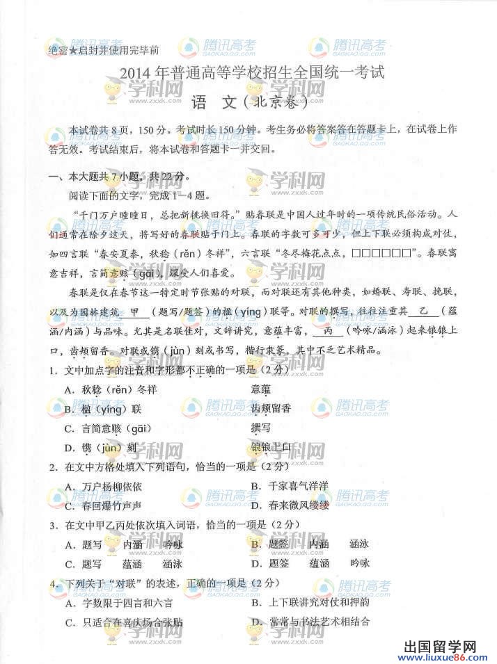 身為一名高三學(xué)生,備受壓力與煎熬,深知高考的重要,祝愿每一位參加高考的同學(xué)都能實(shí)現(xiàn)自己的大學(xué)夢(mèng),真題與答案奉上,讓你第一時(shí)間知曉自己的成績(jī),出國(guó)留學(xué)網(wǎng)高考頻道第一時(shí)間為您提供2014北京高考語(yǔ)文真題及答案解析。