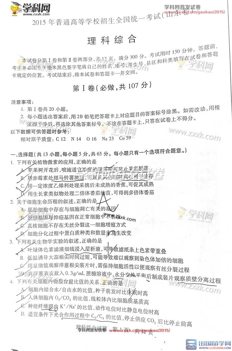 高考后茫然不知所措怎么辦?出國留學(xué)網(wǎng)小編將為您帶來2015年山東理綜高考真題及詳細(xì)解答,為你掃清迷霧認(rèn)清考點(diǎn),不再為盲目失分而煩惱。成績一旦公布將會在此頁面現(xiàn)實(shí),請各位考生及家長密切關(guān)注頁面更新,祝你的高考之路順暢無阻。