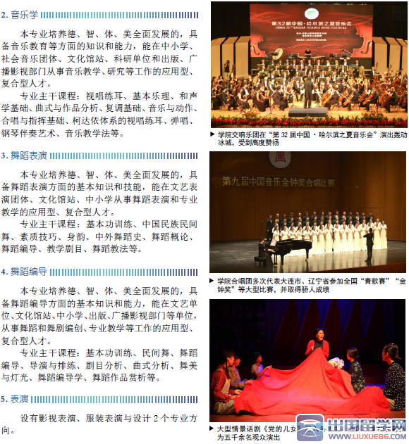 原創(chuàng)清唱?jiǎng) 稖敉芬魳?lè)會(huì)在國(guó)家大劇院世界首演中反響熱烈,在大連市第五屆“新人新劇目”展演中獲優(yōu)秀劇目獎(jiǎng)。原創(chuàng)清唱?jiǎng) 稒阎辍方鹬菪聟^(qū)大劇院成功上演,受到中國(guó)對(duì)外友好協(xié)會(huì)、遼寧省對(duì)外友好協(xié)會(huì)、日本石川縣日中友好協(xié)會(huì)及創(chuàng)價(jià)大學(xué)的一致好評(píng)。學(xué)院藝術(shù)團(tuán)隊(duì)和師生們?cè)趪?guó)內(nèi)外各項(xiàng)賽事中,屢創(chuàng)佳績(jī)。學(xué)院合唱團(tuán)在第八、第九屆中國(guó)音樂(lè)金鐘獎(jiǎng)合唱比賽中兩次獲得銀獎(jiǎng),獲第三、第四屆海峽兩岸合唱節(jié)金獎(jiǎng),在第十四屆CCTV 青歌賽上進(jìn)入決賽。民族室內(nèi)樂(lè)團(tuán)受中國(guó)音協(xié)選派、代表中國(guó)參加白俄羅斯舉辦的國(guó)際民族音樂(lè)節(jié),獲團(tuán)體金獎(jiǎng)和3 項(xiàng)個(gè)人金獎(jiǎng),教育部、中國(guó)音協(xié)發(fā)來(lái)賀信,給予高度贊揚(yáng)。民樂(lè)團(tuán)在遼寧省高校民族器樂(lè)展演中獲5 個(gè)金獎(jiǎng)、3 個(gè)銀獎(jiǎng)、團(tuán)體第一名和唯一最佳指揮獎(jiǎng)。學(xué)院交響樂(lè)團(tuán)在“第32 屆中國(guó)·哈爾濱之夏音樂(lè)會(huì)”演出轟動(dòng)冰城。