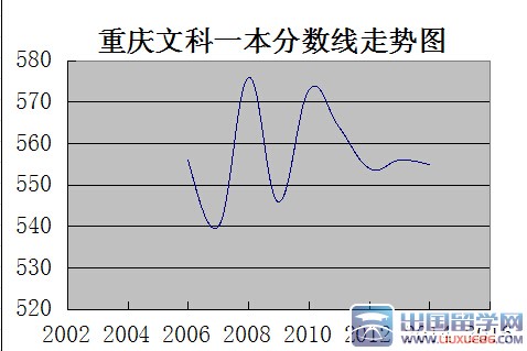 重慶文科一本分?jǐn)?shù)線2006年到2011年變化比較大,2012年到2014年趨向于穩(wěn)定,由上圖可以預(yù)測(cè)2015年重慶文科一本分?jǐn)?shù)線變化不會(huì)特別大,應(yīng)該在555分上下波動(dòng)。 (以上數(shù)據(jù)僅供參考!)