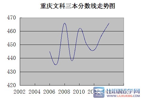 重慶文科三本分?jǐn)?shù)線2006年到2012年波動(dòng)比較大,從2012年起分?jǐn)?shù)線開始上漲,由上圖可以預(yù)測(cè)2015年重慶文科三本分?jǐn)?shù)線很有可能上漲,預(yù)計(jì)450分左右! (以上數(shù)據(jù)僅供參考!)