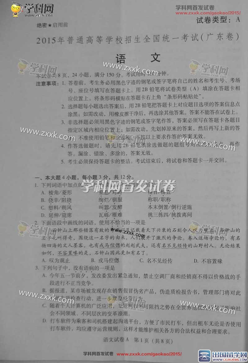 高考,你不是一個人在戰(zhàn)斗!出國留學(xué)網(wǎng)為你精選2015年廣東高考語文真題及詳解,做你背后的軍師,幫助你分析每一道題目的幕后真相,讓失分不再冤枉!請考生及家長關(guān)注本頁面的更新信息,本網(wǎng)站將實時更新高考資訊,請不要錯過。