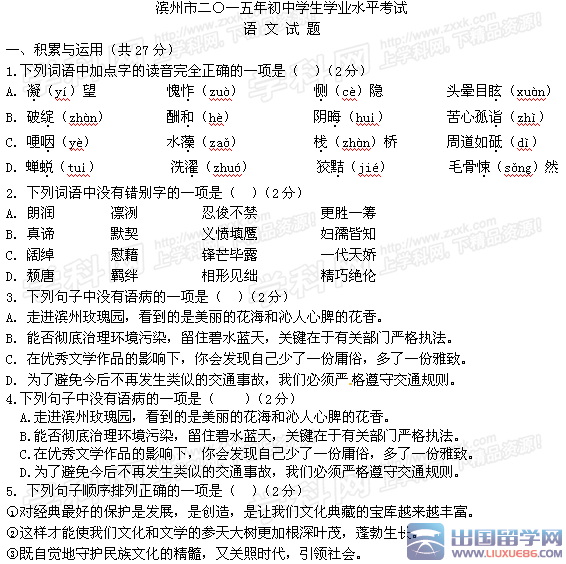 紙上得來終覺淺,絕知此事要躬行。出國留學網(wǎng)中考頻道的小編會及時為廣大考生提供:2015年山東濱州中考語文試題及答案 ,有需要的考生可以在考題公布后刷新本頁面(按ctrl+F5),希望對大家有所幫助。