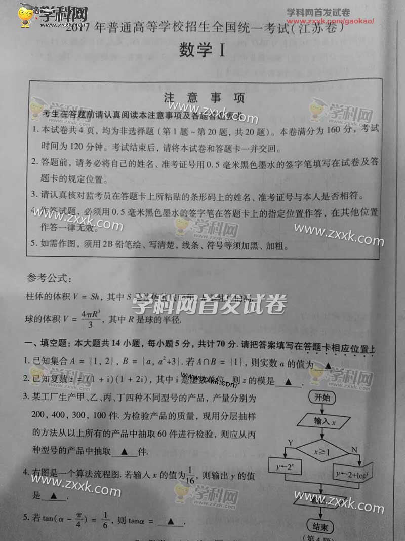 2017年江蘇高考數(shù)學(xué)真題與答案
