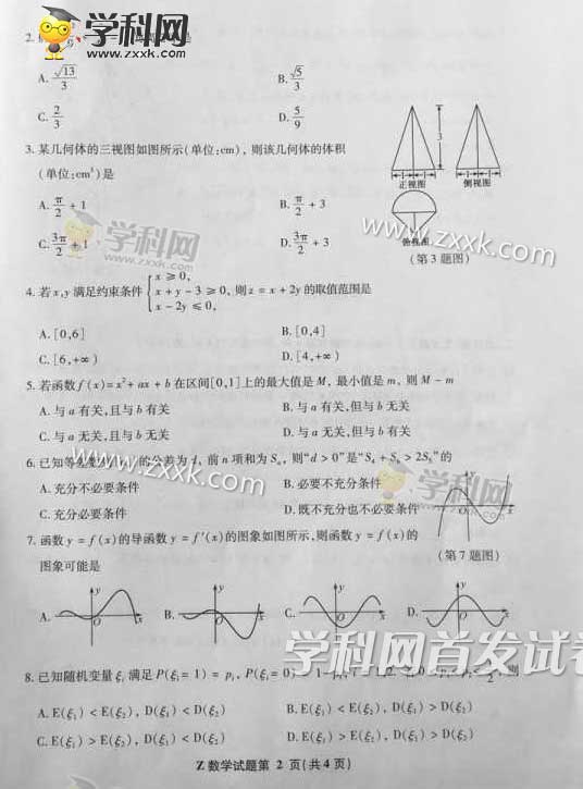 2017金華高考數(shù)學(xué)真題及答案(圖片版)