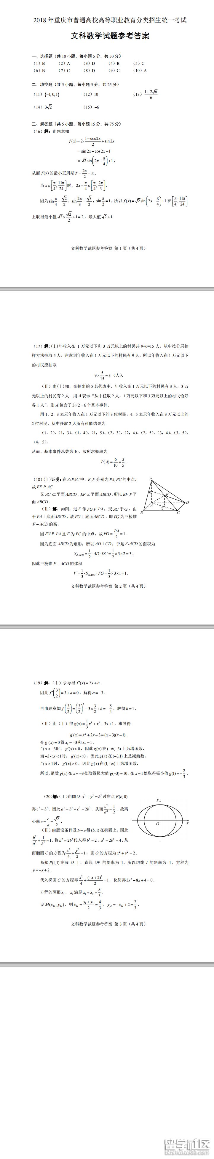 2018重慶普通高校高職教育分類招生考試文科數(shù)學(xué)答案