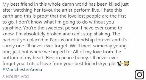 A妹來(lái)曼城開(kāi)演唱會(huì),22歲的人肉炸彈在場(chǎng)外自爆。22死119傷,無(wú)辜的生命就這樣殞沒(méi)。18歲的Georgina Callander不治身亡,遠(yuǎn)在新西蘭的好友Skye寫(xiě)下了悼文: