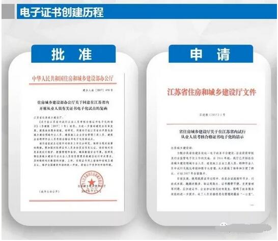 2017年7月7日,住建部批準(zhǔn)江蘇省住房城鄉(xiāng)建設(shè)廳率先試行行業(yè)從業(yè)人員考核合格證書(shū)電子化試點(diǎn)。