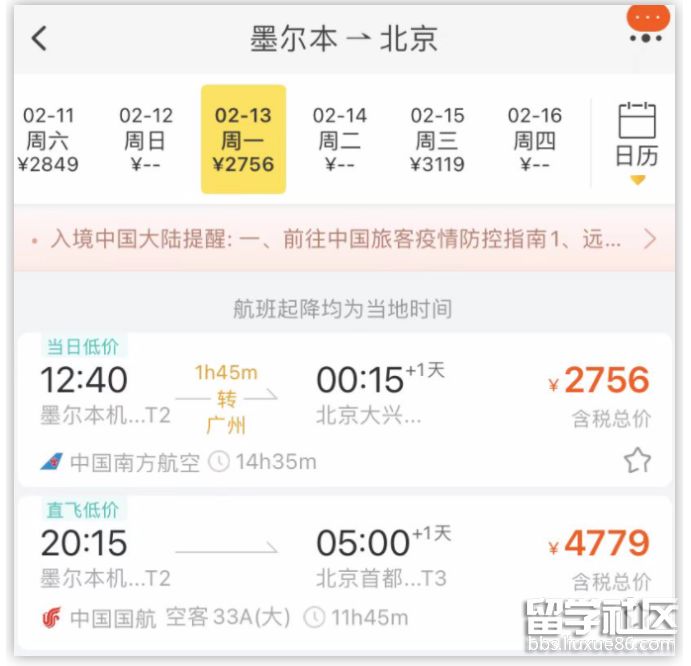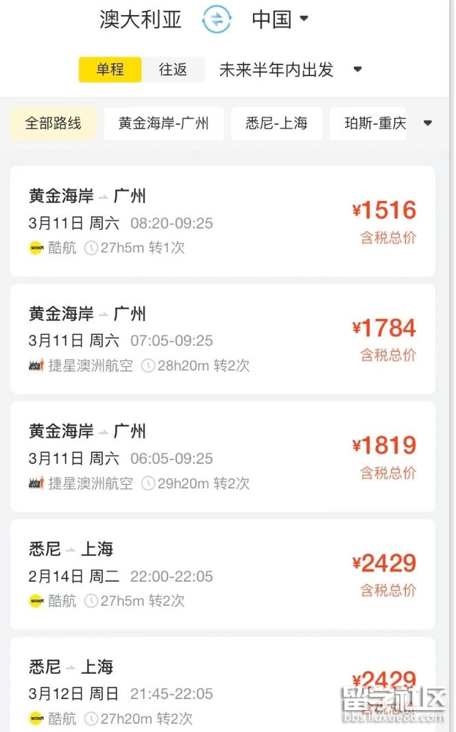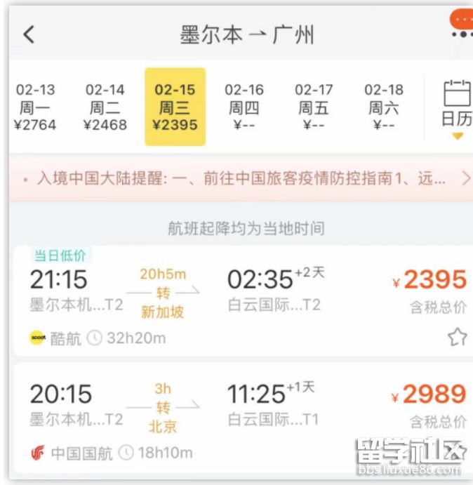 比如從墨爾本飛往廣州,轉(zhuǎn)機后的價格均為2000+人民幣。
