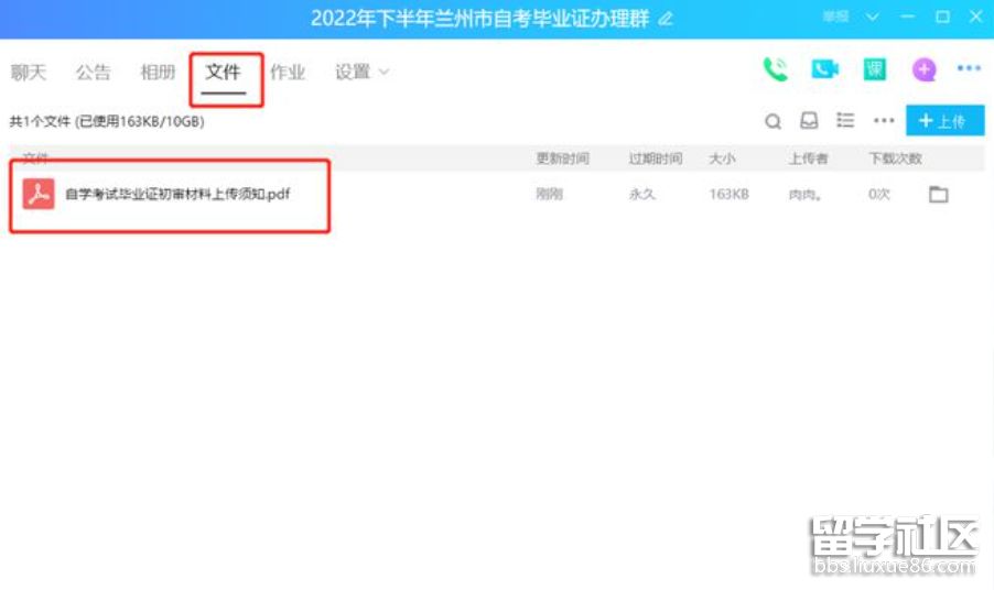 二、根據群公告內容,打開群文件,下載保存《自學考試畢業(yè)證初審材料上傳須知》。
