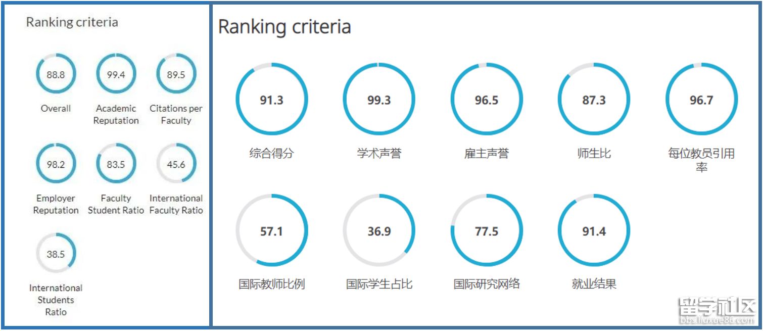 對比一下兩年的得分,學(xué)術(shù)聲譽(yù)、雇主聲譽(yù)和國際學(xué)生占比有輕微下滑,而論文引用指數(shù)(即圖中每位教員引用率)、國際教師占比、師生比這三項(xiàng)的提升都比較明顯,加權(quán)平均之下,總分從88.8上升到了91.3,排名一路上漲。(最后兩項(xiàng)“國際研究網(wǎng)絡(luò)”、“就業(yè)結(jié)果”為今年引入的新指標(biāo),但并未參與今年的排名,所以我們不考慮)