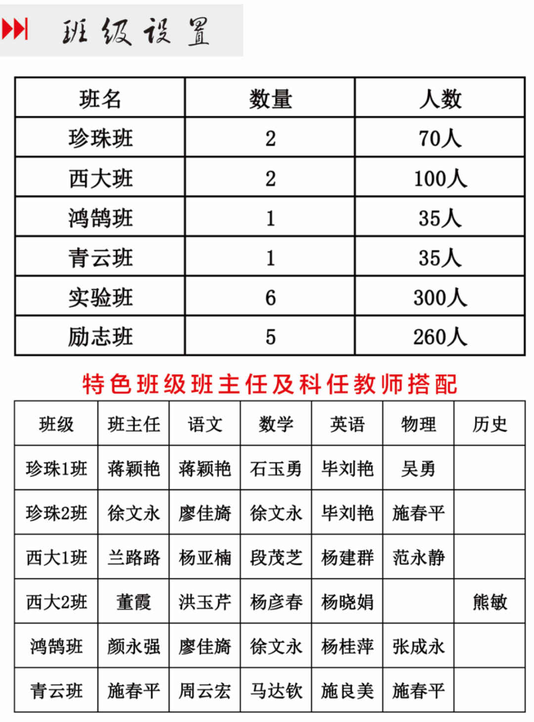 1.昌寧縣第一中學(xué)2024年計劃招收高一新生800人,共開設(shè)17個班級,其中特色班級分別開設(shè)2個珍珠班(70人)、2個西南大學(xué)昌寧高中班(100人)、1個鴻鵠班(35人)、1個青云班(35人)。6個實驗班(300人),5個勵志班(260人)。