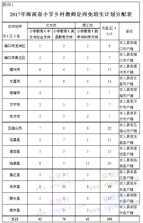 附件:1.2017年海南省小學(xué)鄉(xiāng)村教師定向免培生計(jì)劃分配表