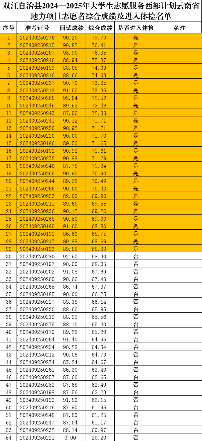 雙江自治縣2024—2025年大學(xué)生志愿服務(wù)西部計(jì)劃云南省地方項(xiàng)目志愿者計(jì)劃招募29人,經(jīng)發(fā)布公告、報(bào)名、筆試、資格審核、面試等程序,現(xiàn)將綜合成績(jī)及體檢安排公示如下: