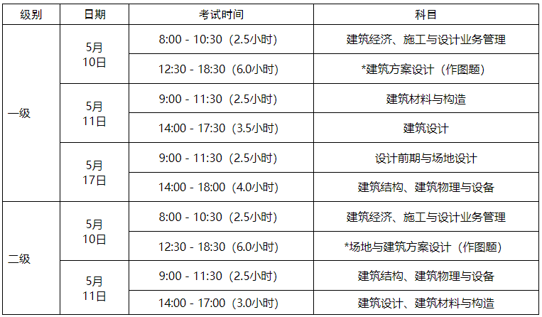 2025年度全國一級注冊建筑師資格考試時間為相鄰2個周末共3天,二級注冊建筑師資格考試時間為2天。