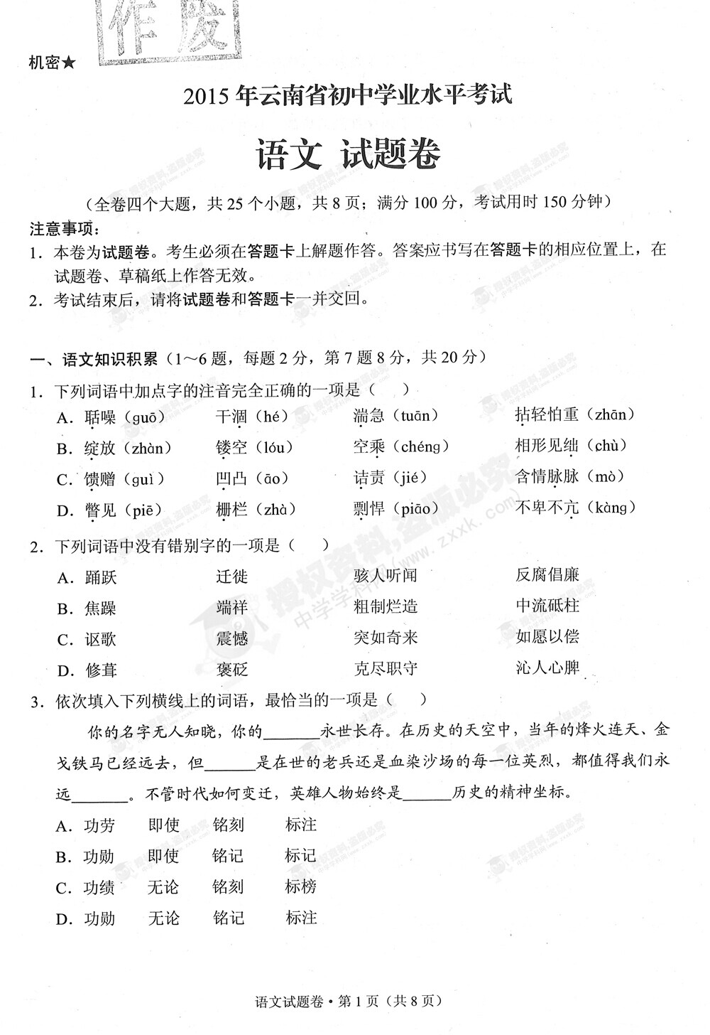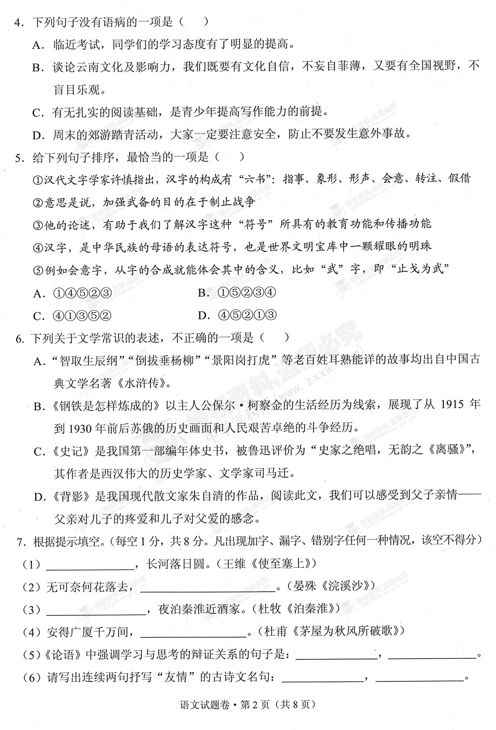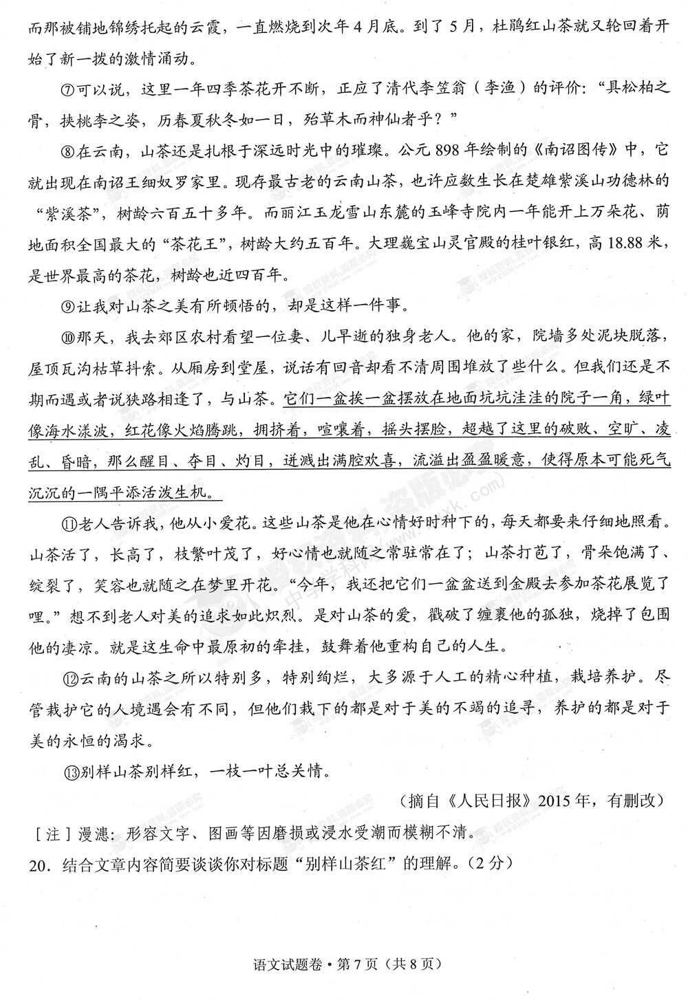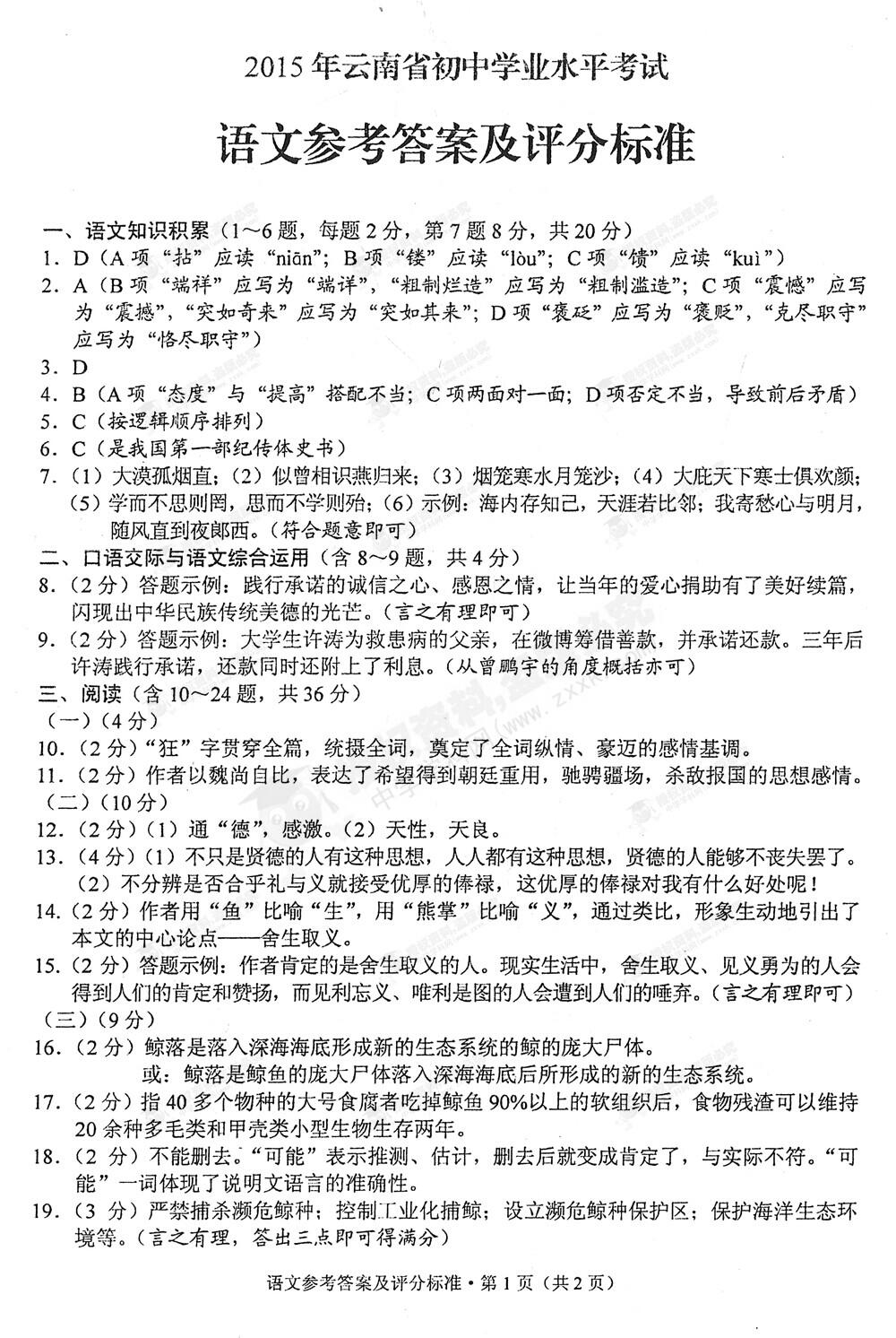 2015年云南中考語文試卷及答案(完整版)
