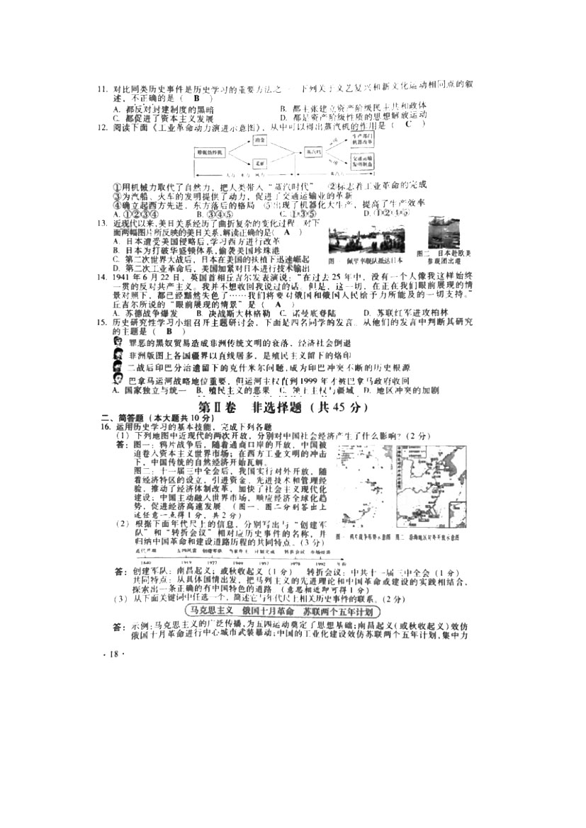 2017年山西陽泉中考?xì)v史答案(已公布)