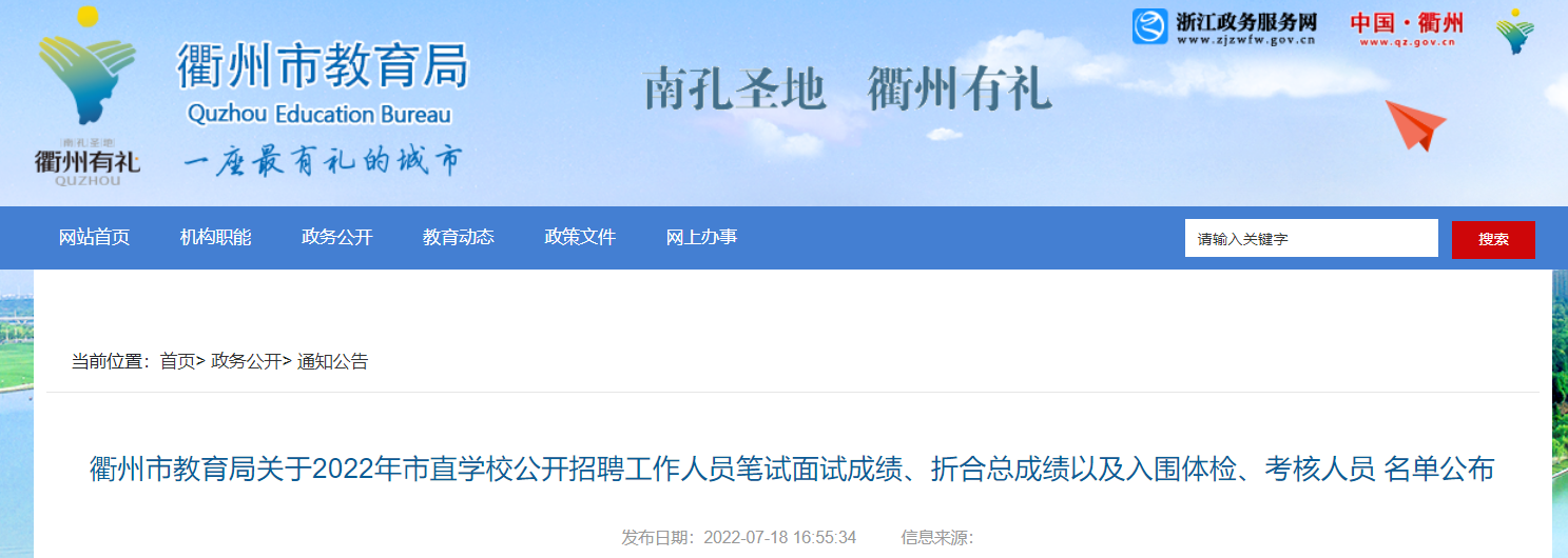 2022浙江衢州市直學(xué)校招聘筆試面試成績(jī)、折合總成績(jī)以及入圍體檢、考核人員名單公布