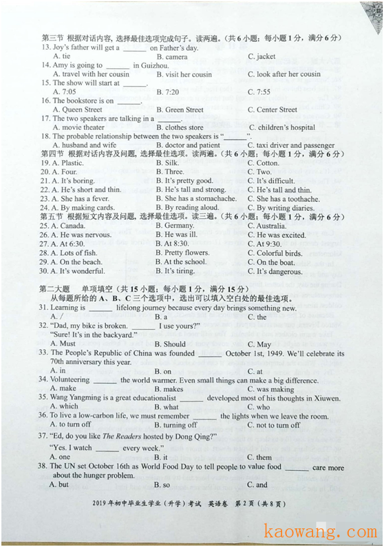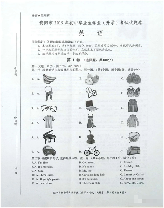 2019年貴州貴陽中考英語考試已結(jié)束,中考頻道搜集整理發(fā)布了“2019年貴州貴陽中考英語試卷”,供考生們參考學(xué)習(xí),小編預(yù)祝大家取得優(yōu)異的成績(jī)!