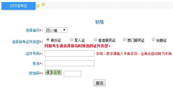 考生登錄全國(guó)會(huì)計(jì)資格評(píng)價(jià)網(wǎng)(http://kjbm11.mof.gov.cn/ksbm/usercxzkz.jsp),點(diǎn)擊“準(zhǔn)考證打印”按鈕,選擇四川省和證件類型(身份證、軍官證、護(hù)照、港澳居民證、臺(tái)胞證等),并錄入證件號(hào)碼和附加碼,點(diǎn)擊〔查詢〕按鈕進(jìn)入下一級(jí)頁面后,再點(diǎn)擊〔打印〕,自行打印準(zhǔn)考證。