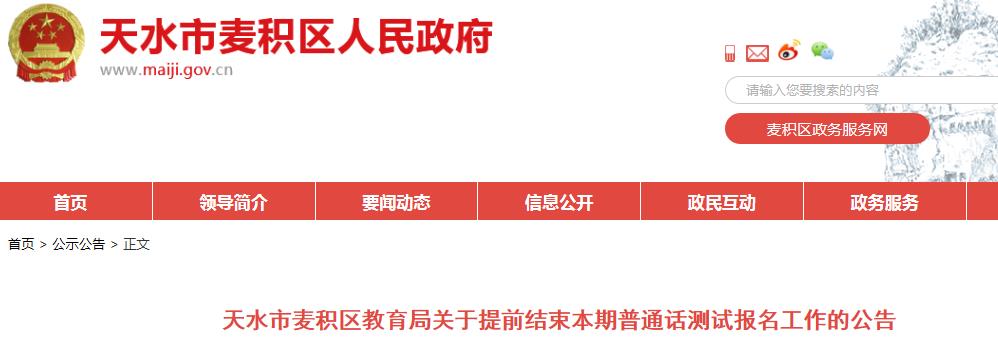 從天水市麥積區(qū)人民政府獲悉,2020年甘肅天水麥積區(qū)提前結(jié)束普通話測試報名工作的公告已公布,請相關(guān)人員仔細閱讀,具體詳情如下: