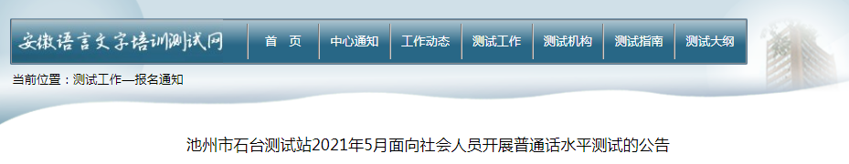 從安徽語言文字培訓測試網(wǎng)發(fā)布的《2021年5月安徽池州市石臺面向社會人員開展普通話水平測試的公告》得知,2021年5月安徽池州市普通話考試時間為5月22日,具體詳情如下: