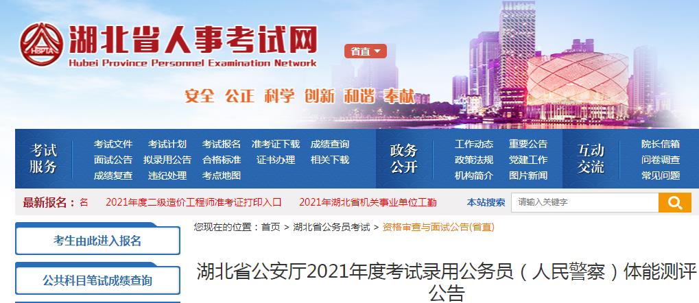 2021年湖北省公安廳考試錄用人民警察體能測評公告已公布,為了方便廣大考生的查閱,下面為您詳細(xì)介紹一下本次人民警察體能測評的具體事宜,希望廣大考生及時(shí)關(guān)注,如有相關(guān)疑問,請關(guān)注招警考試頻道為您實(shí)時(shí)做出的更新。
