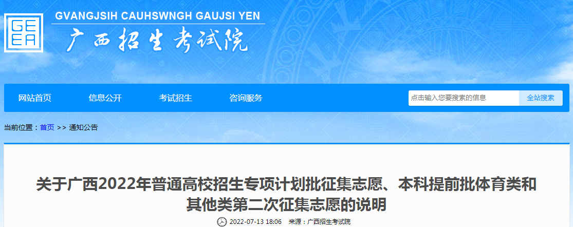 從廣西招生考試院了解到,廣西2022年專項(xiàng)計(jì)劃批征集志愿、本科提前批體育類和其他類第二次征集志愿的說明已發(fā)布,詳細(xì)內(nèi)容如下: