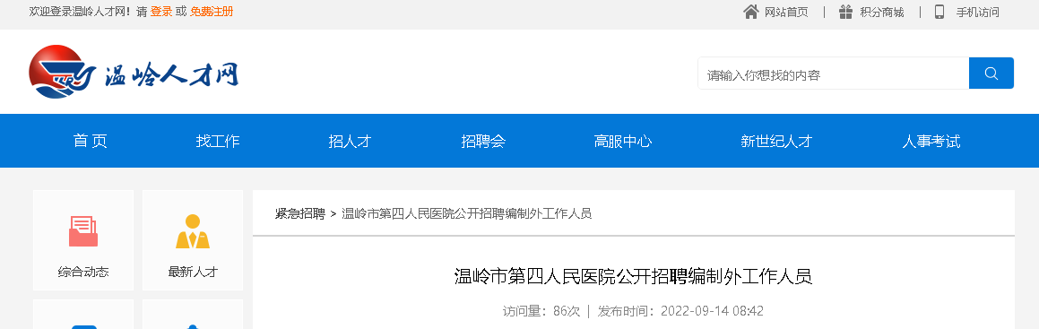 2022浙江臺(tái)州市溫嶺市第四人民醫(yī)院招聘編制外工作人員,報(bào)名時(shí)間:2022年9月13日----2022年9月19日;上午8:00-11:30,下午13:30-16:30(周日除外),現(xiàn)將招聘公告原文發(fā)布如下: