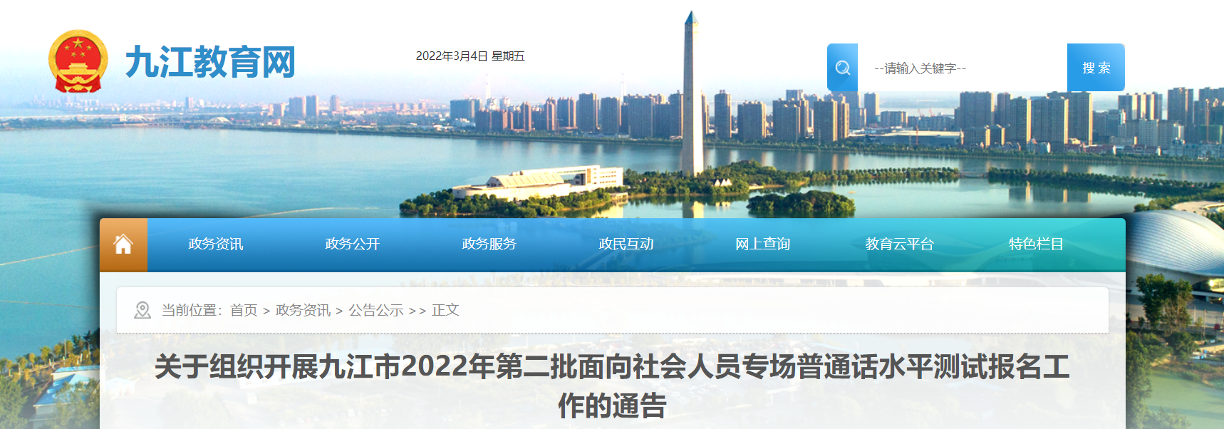 從九江教育網(wǎng)發(fā)布的《 2022年江西九江第二批面向社會(huì)人員專(zhuān)場(chǎng)普通話水平測(cè)試報(bào)名工作通告》得知,xxxx已公布,報(bào)名時(shí)間為3月9日-3月10日,=具體詳情如下: