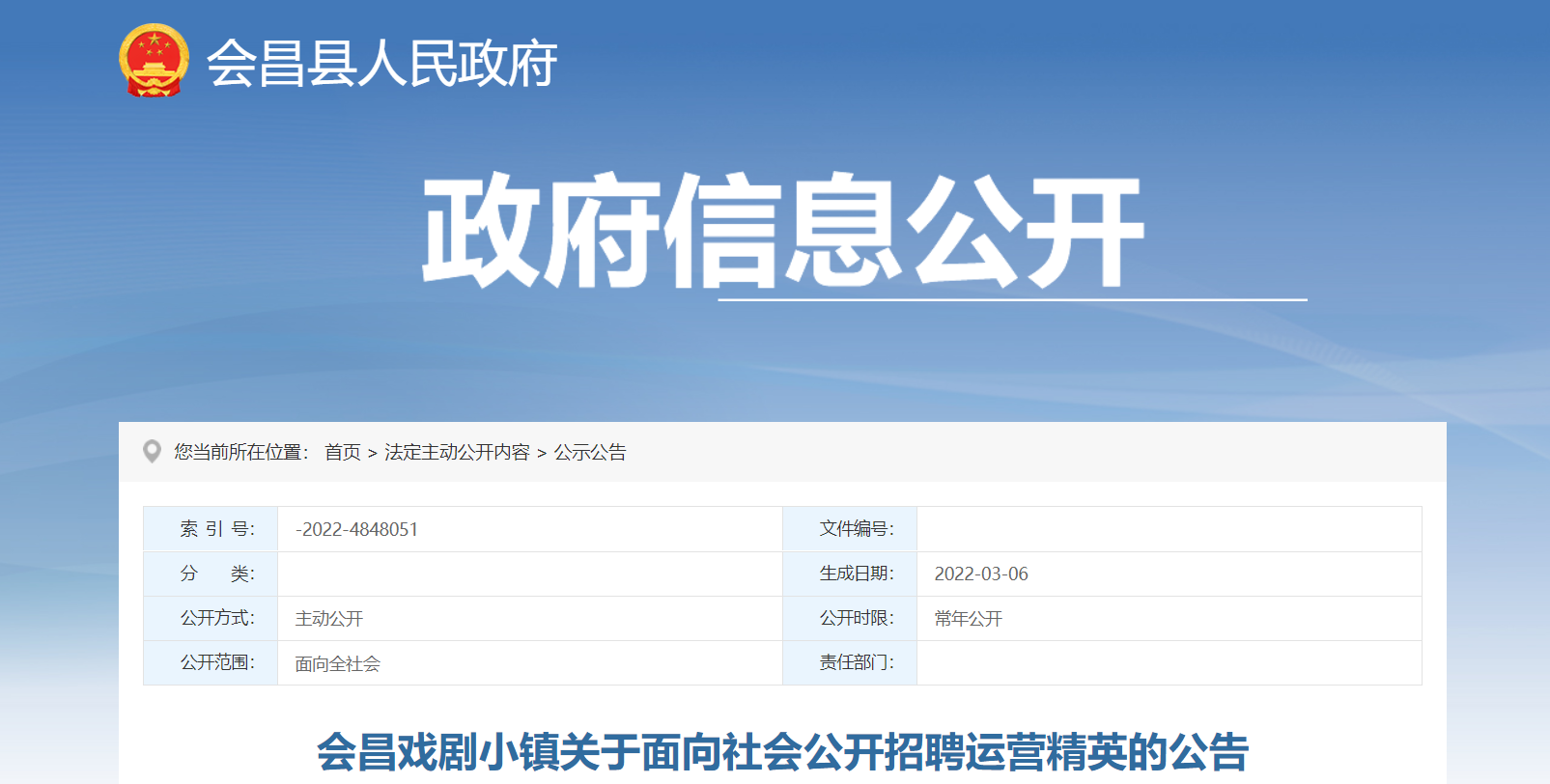 2022江西省贛州市會昌戲劇小鎮(zhèn)招聘運營精英公告已發(fā)布。會昌戲劇小鎮(zhèn)已完成核心區(qū)域的開發(fā)建設并進入招商階段,為加速推進小鎮(zhèn)經營發(fā)展,引入先進運營管理理念,增強專業(yè)人才隊伍力量,結合業(yè)務發(fā)展需要,決定面向社會公開招聘運營精英3人。此次招聘由會昌縣發(fā)展集團委托第三方專業(yè)招聘機構承辦招聘服務。現將有關事項公告如下。為您整理了招聘條件和報名流程,供您參考。