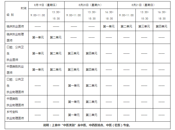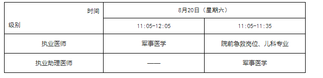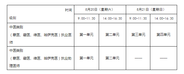考試實行計算機(jī)化考試,軍隊現(xiàn)役人員加試軍事醫(yī)學(xué)、院前急救崗位和兒科專業(yè)加試相應(yīng)內(nèi)容。中醫(yī)類別蒙醫(yī)、藏醫(yī)、維醫(yī)、哈薩克醫(yī)專業(yè)實行紙筆考試。統(tǒng)一考試時間如下: