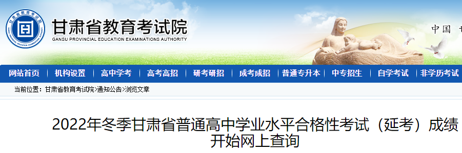 甘肅省教育考試院現(xiàn)已開通普通高中學業(yè)水平合格性考試成績查詢功能,考生可在4月3日12:00至7日18:00,登錄網(wǎng)站查詢2022年冬季普通高中學業(yè)水平合格性考試(延考)成績?,F(xiàn)將有關(guān)事項說明如下: