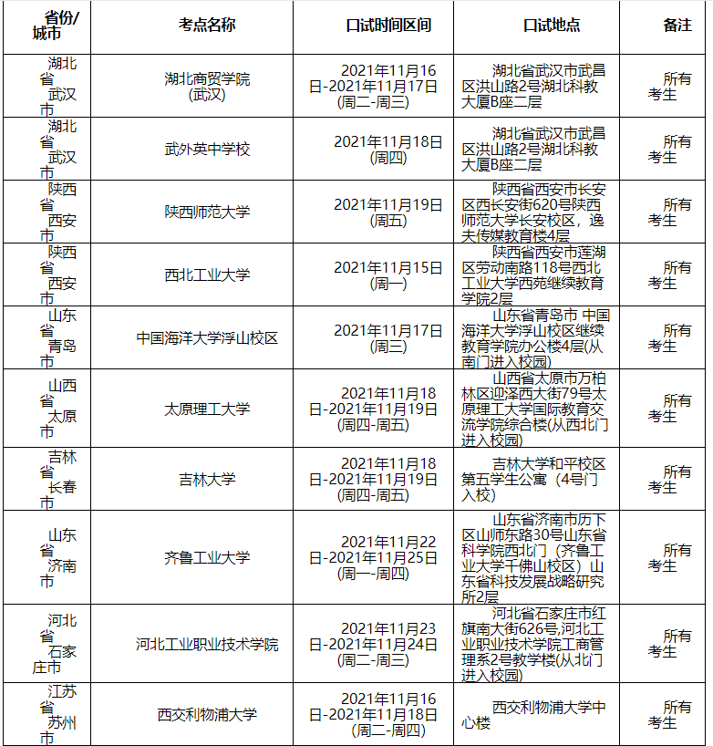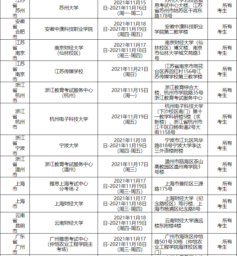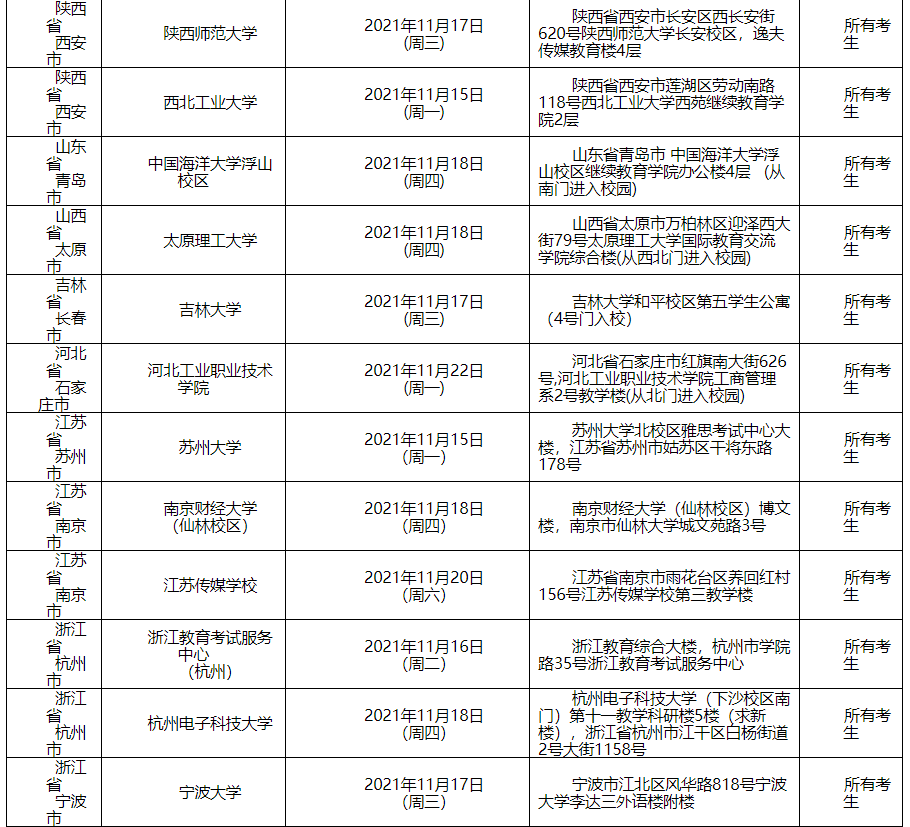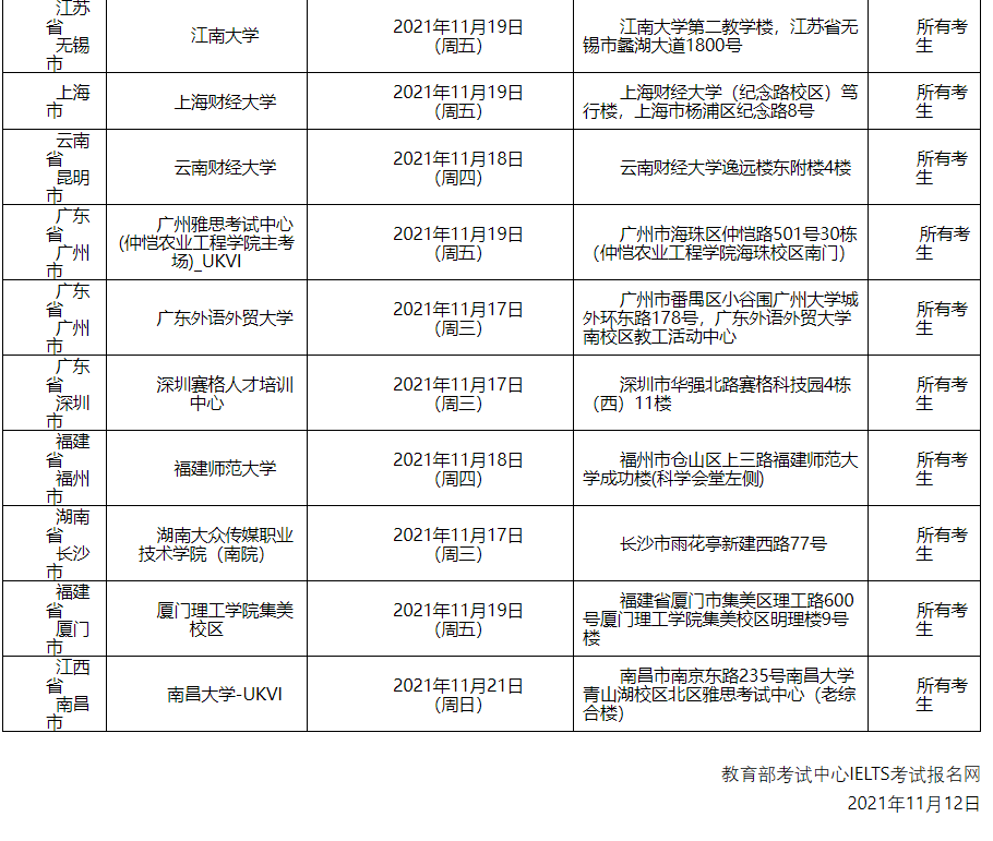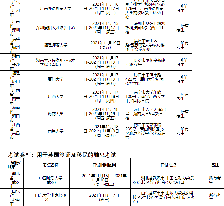 接英國文化教育協(xié)會(huì)通知,報(bào)考2021年11月20日雅思考試的考生口語安排如下,供廣大考生參考。請(qǐng)按照?qǐng)?bào)名網(wǎng)站公布的準(zhǔn)考證打印時(shí)間登錄雅思考試報(bào)名網(wǎng)站查詢您的口試安排,打印準(zhǔn)考證并以準(zhǔn)考證信息為準(zhǔn)。