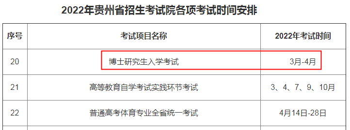考博頻道根據(jù)貴州招生考試院公布的《2022年各項考試時間安排表》了解到,2022年廣西博士研究生入學(xué)考試時間初步確定,安排在2022年3月至4月期間舉行。具體如下: