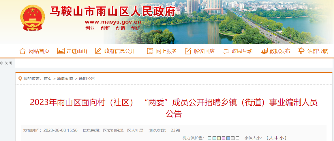 2023年安徽省馬鞍山市雨山區(qū)面向村社區(qū)兩委成員招聘鄉(xiāng)鎮(zhèn)街道事業(yè)編制人員4人。報(bào)名時(shí)間:2023年6月15日——2023年6月20日(工作日上午8:00——11:30,下午14:30——17:00),逾期不再補(bǔ)報(bào)?,F(xiàn)將公告原文發(fā)布如下:
