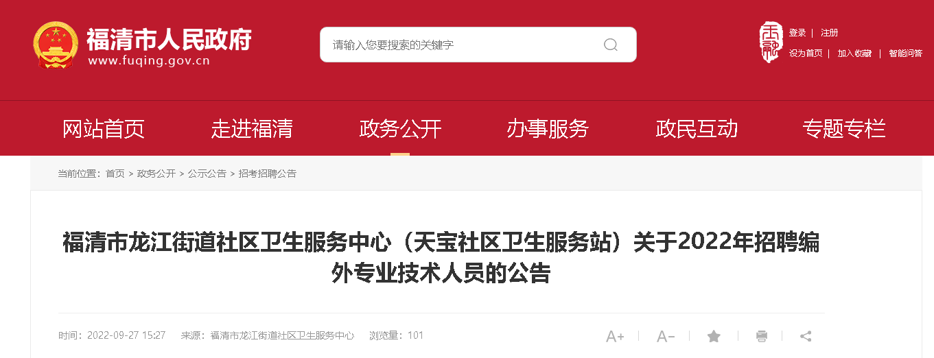 原文標(biāo)題:福清市龍江街道社區(qū)衛(wèi)生服務(wù)中心(天寶社區(qū)衛(wèi)生服務(wù)站)關(guān)于2022年招聘編外專業(yè)技術(shù)人員的公告