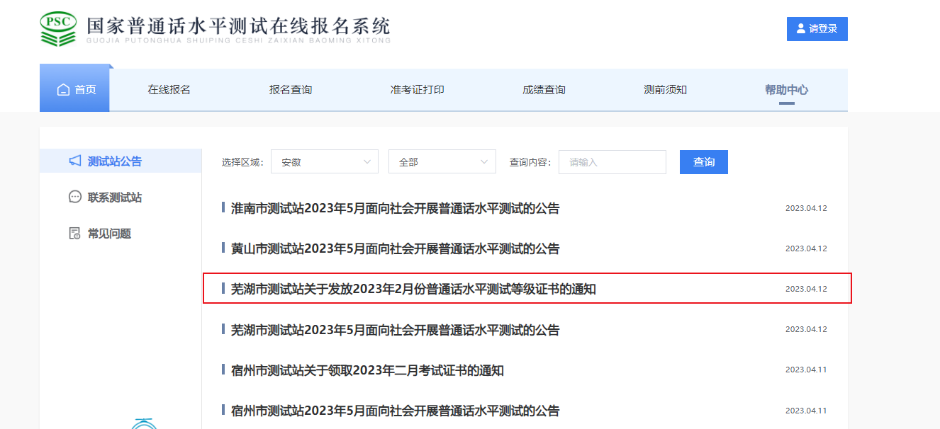 不在我站(蕪湖市普通話水平測(cè)試站)參加測(cè)試的考生,其證書不由我站發(fā)放,請(qǐng)登錄“報(bào)名系統(tǒng)”(https://bm.cltt.org/)-“幫助中心”-“測(cè)試站公告”頁面查詢對(duì)應(yīng)測(cè)試站的發(fā)證通知。