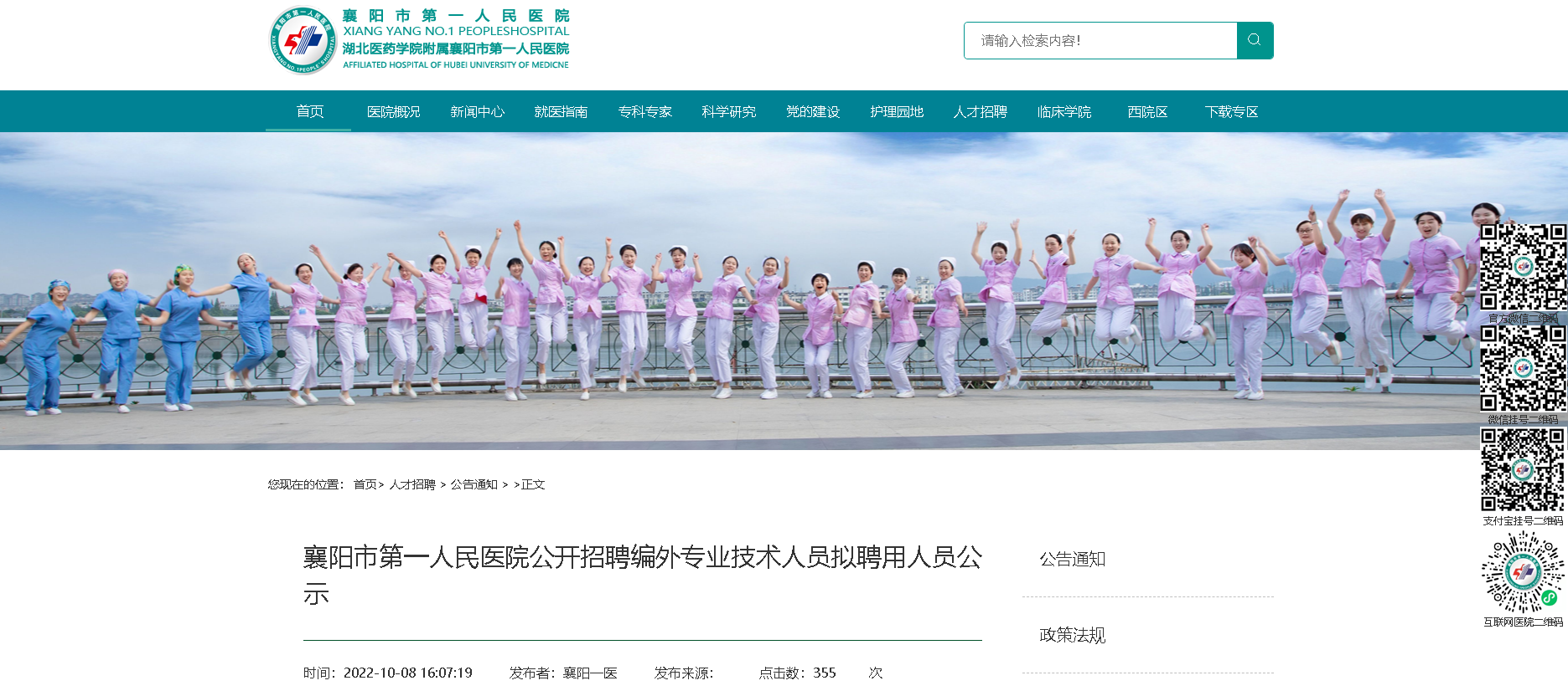 2022湖北襄陽市第一人民醫(yī)院招聘編外專業(yè)技術(shù)人員擬聘用公示已出,公示時間:2022年10月8日至2022年10月14日,現(xiàn)將招聘公示原文發(fā)布如下: