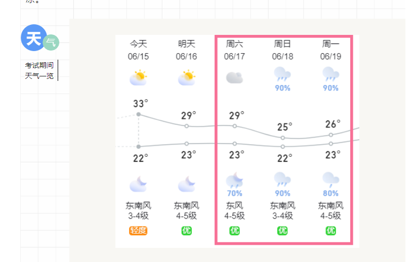 (五)關(guān)注天氣變化。請(qǐng)考生和家長們留意考試期間天氣變化,備好雨具;我市所有考場內(nèi)均安有空調(diào),如果天氣炎熱,考場內(nèi)將開空調(diào),建議考生帶一件長袖襯衫以防受涼。