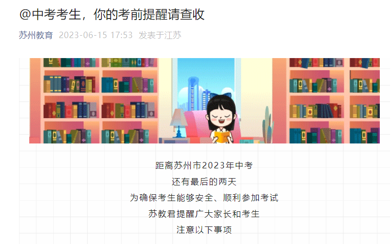 從蘇州教育局獲悉,2023年江蘇蘇州中考時(shí)間6月17-19日,考前提醒已公布,具體詳情如下: