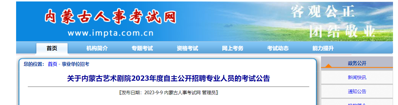 2023年內(nèi)蒙古藝術(shù)劇院自主招聘專業(yè)人員考試??荚嚂r(shí)間:2023年9月18日—10月14日?,F(xiàn)將公告原文發(fā)布如下: