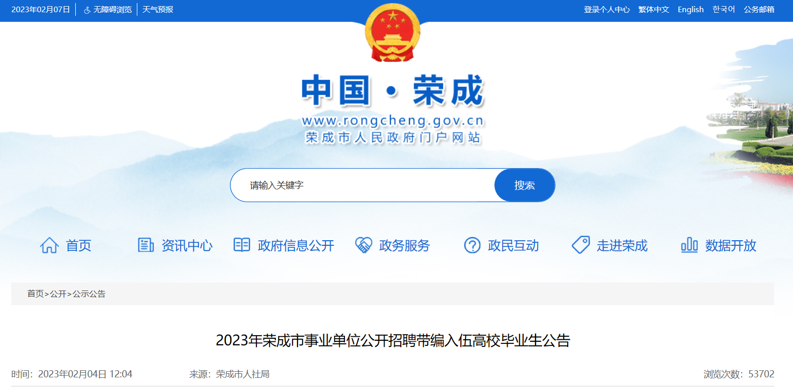 2023年山東省威海榮成市事業(yè)單位招聘帶編入伍高校畢業(yè)生7人。本次招聘報名組織工作由榮成市人民政府征兵辦公室、榮成市人力資源和社會保障局具體負責?,F(xiàn)將公告原文發(fā)布如下: