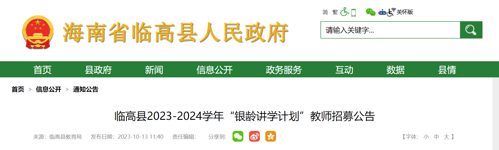 2023-2024學(xué)年海南臨高縣“銀齡講學(xué)計(jì)劃”教師招募5人,報(bào)名時間:2023年10月16日-10月20日,現(xiàn)將招聘公告原文發(fā)布如下:
