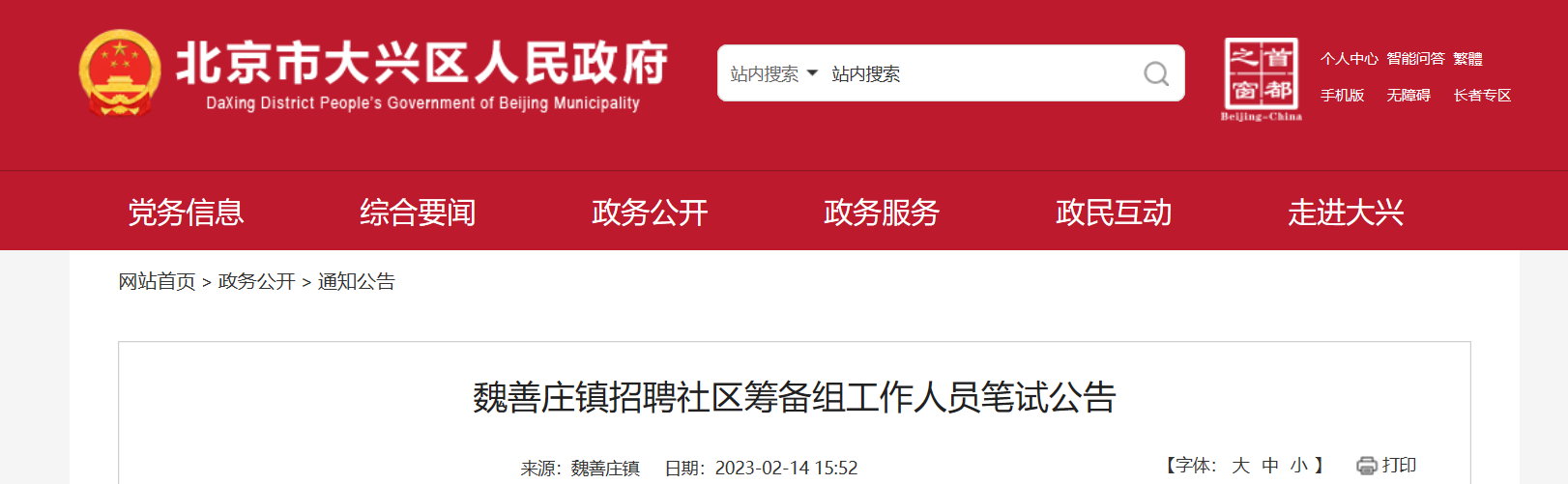 2023年北京魏善莊鎮(zhèn)招聘社區(qū)籌備組工作人員筆試。考試時(shí)間2023年2月19日(星期日)上午9:00-11:00?,F(xiàn)將公告原文發(fā)布如下: