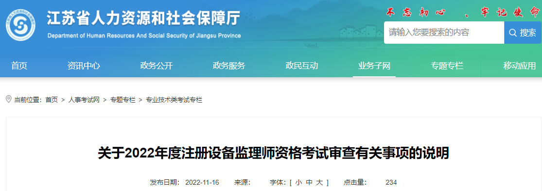根據(jù)《江蘇省人力資源社會(huì)保障廳關(guān)于進(jìn)一步加強(qiáng)專業(yè)技術(shù)人員資格考試審查工作的通知》(蘇人社發(fā)〔2018〕383號(hào))、省人力資源社會(huì)保障廳省市場(chǎng)監(jiān)督管理局《關(guān)于2022年度注冊(cè)設(shè)備監(jiān)理師執(zhí)業(yè)資格考試考務(wù)工作有關(guān)事項(xiàng)的通知》(蘇人社函〔2022〕246號(hào))文件規(guī)定和要求,我省將對(duì)2022年度注冊(cè)設(shè)備監(jiān)理師執(zhí)業(yè)資格考試全部科目成績(jī)合格人員進(jìn)行考后資格審查,現(xiàn)將有關(guān)事項(xiàng)通知如下: